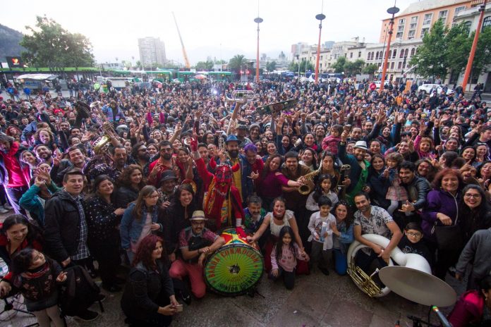 Una tarde lluviosa en la capital, este lunes 12 de noviembre, no fue impedimento para que se reunieran alrededor de mil personas en el frontis de la Estación Mapocho para disfrutar de un efervescente concierto de la agrupación nacional Banda Conmoción, quienes con su particular estilo que mezcla sonidos latinoamericanos, con murga, cumbia y un chinchinero hicieron bailar a grandes y chicos.