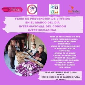 El próximo lunes 16 de septiembre se celebra el Día Internacional del Condón Interno, fecha instituida por organizaciones internacionales de salud. Las actividades de conmemoración del Día Internacional del Condón Femenino e interno en Chile comenzarán este viernes 13 de septiembre desde las 10.00 horas en la Plaza de Armas de Santiago, instancia donde se ofrecerá el testeo VIH rápido gratuito, condones internos e información se diversos servicios públicos.