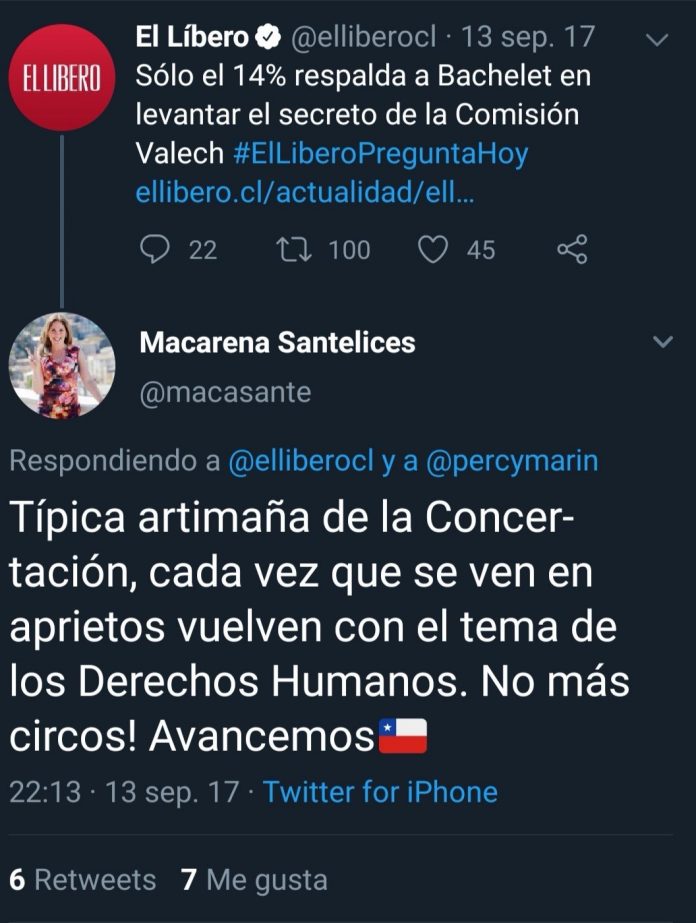 Junto con no haber realizado en sus redes sociales ninguna referencia a la violencia ejercida por agentes de Estado en el marco de las movilizaciones sociales, Santelices escribió: “Y los derechos humanos de los que queremos Paz y llegar a acuerdos? Dónde están? Hasta cuando el FP, el PC, el @inddhh y ahora Amnistía Internacional @AmnistiaOnline siguen justificando la destrucción de Chile. 130 comisarías @Carabdechileatacadas, quemas en todas las comunas”.