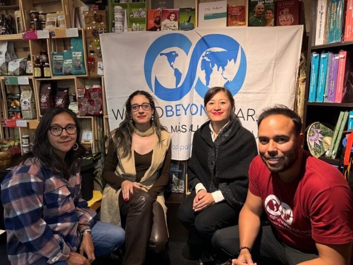 Cada región del mundo, cada rincón del mundo, con sus particularidades, pero también nos organizamos a través de organizaciones aliadas, afiliadas a “World Beyond War”, a “Un Mundo Más Allá de la Guerra”, que son organizaciones con las cuales trabajamos, porque nos reconocemos como parte de un gran ecosistema, de un gran movimiento de organizaciones, de plataformas, y de espacios internacionales que también trabajan en el mismo campo, que se proponen, de distintas formas, también lograr los objetivos que nos hemos propuesto, que no son otros, por ejemplo, en el caso de América Latina, que construir, y hacer de nuestra región una América Latina como una verdadera zona de paz.