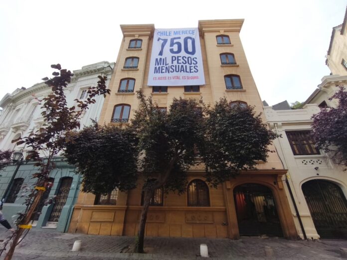 «Chile merece 750 mil pesos mensuales. Es justo. Es vital. Es Seguro», dice el texto de la pieza, que a partir de este viernes acompaña el tradicional barrio de calles sinuosas estrechas de adoquines.