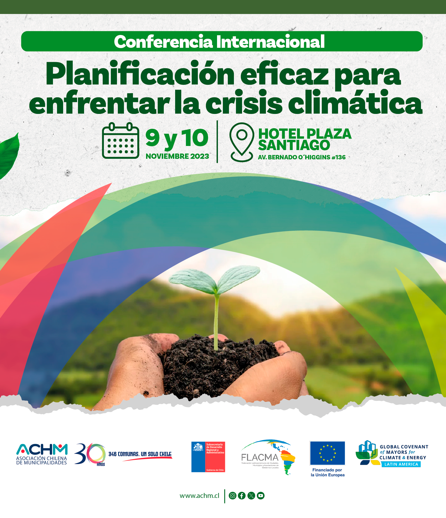 En el marco de la celebración de los 30 años de la Asociación Chilena de Municipalidades (ACHM) y con aportes de la Subsecretaría de Desarrollo Regional y Administrativo, (SUBDERE) y el Pacto Global de Alcaldes por el Clima y la Energía (GCOM-América Latina) de la Unión Europea (UE), se realiza en Santiago, este 9 y 10 de noviembre, la Conferencia Internacional “Planificación eficaz para enfrentar la crisis climática: Oportunidades y desafíos para la gestión municipal”.