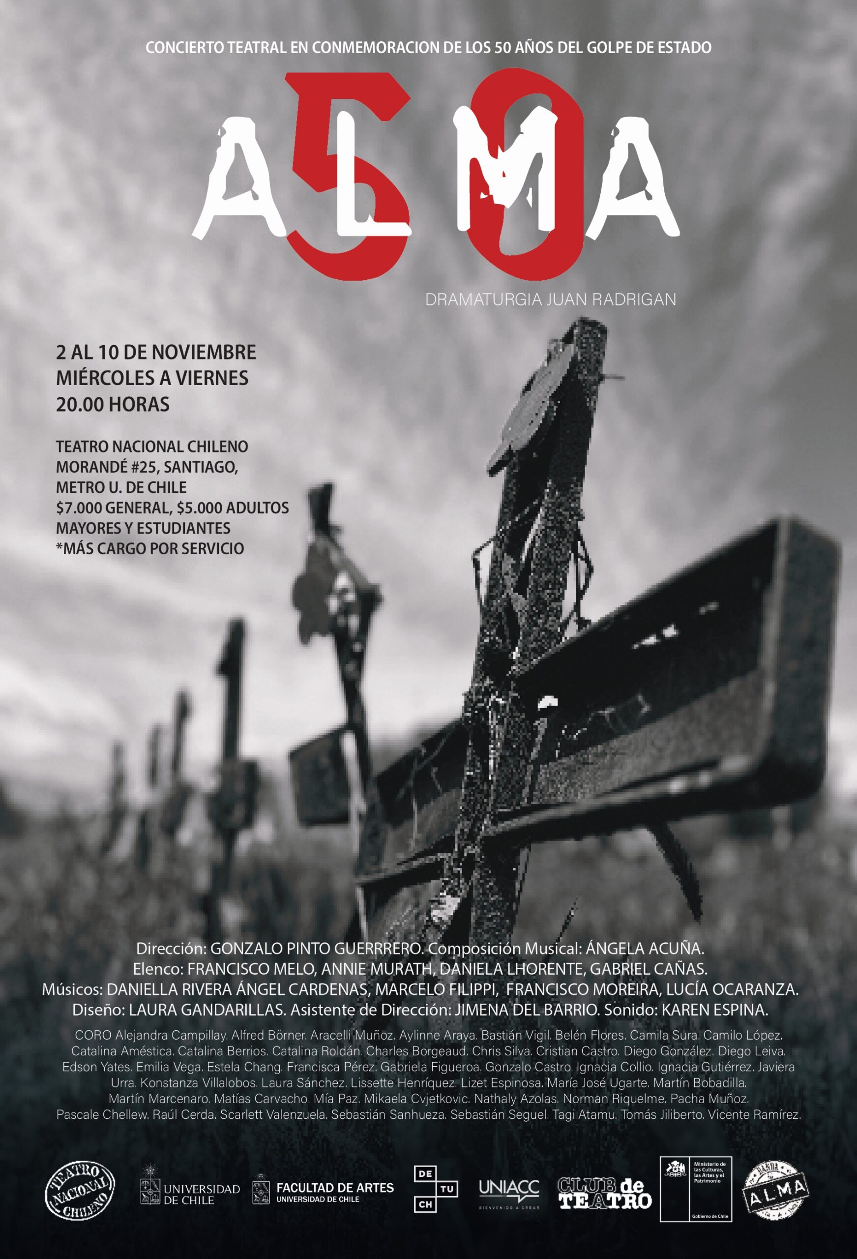 ALMA 50, es un concierto teatral, en formato de cantata donde los personajes de la dramaturgia de Juan Radrigán, que se reúnen en una oficina de quejas en el purgatorio, con la única misión de reclamar por sus diferentes necesidades que fueron arrebatadas hace 50 años, en un septiembre de rostros olvidados y perdidos. Cada Alma llega con la necesidad imperiosa de recuperar el amor; es desde esas quejas, que nacen sus desgarrados y emociones a partir de canciones, compuestas por Ángela Acuña, y dirigidos escénicamente por Gonzalo Pinto.
