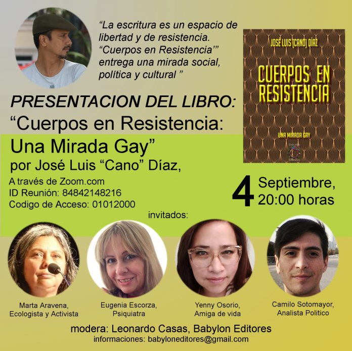 Invitamos a todas y a todos a unirse este viernes 4 de septiembre junto a BabylonEdiciones y a José Luis “Cano” Díaz al lanzamiento oficial de “Cuerpos en Resistencia”. Actividad que debido a las consideraciones actuales de la pandemia se realizará vía Internet. A la cita junto a José Luis, se unirán Marta Aravena (activista y ecologista), Eugenia Escorza (Psiquiatra y amiga del autor), YennyOsorio (amiga del autor) y Camilo Sotomayor (cientista político y amigo del autor).