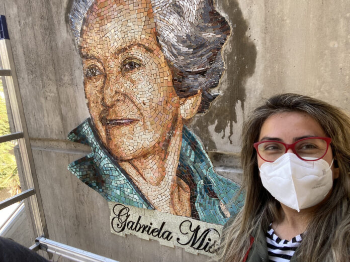 Durante dos meses, la mosaiquista trabajó el rostro de Gabriela Mistral en su taller de Antofagasta, para posteriormente trasladar la obra e instalarla en el GAM: