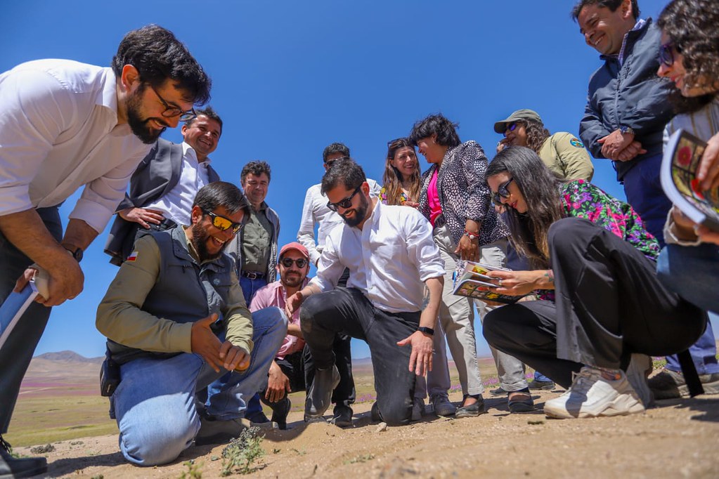 En el Día Nacional del Medio Ambiente, el presidente Gabriel Boric llegó hasta la Región de Atacama, junto a la ministra vocera de Gobierno, Camila Vallejo; la ministra de Bienes Nacionales, Javiera Toro; el ministro (s) de Medio Ambiente, Maximiliano Proaño; el ministro de Agricultura, Esteban Valenzuela, y el director ejecutivo de CONAF, Christian Little, para anunciar la creación del nuevo Parque Nacional Desierto Florido, con el que se busca proteger la biodiversidad del lugar y el fenómeno de floración en el desierto más árido del mundo.