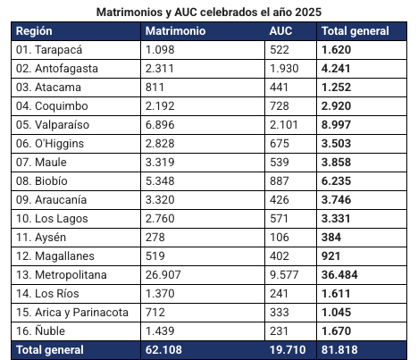 Durante 2025, en el país se celebraron 62.108 matrimonios y se suscribieron 19.710 Acuerdos de Unión Civil. En el mismo período, se inscribieron 34.371 divorcios.