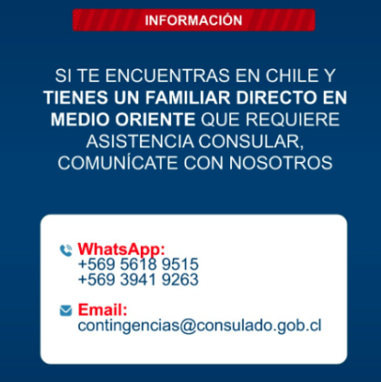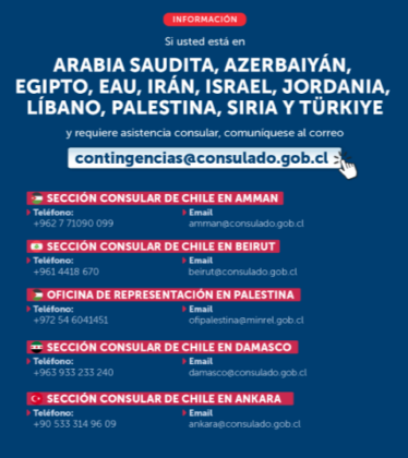 Finalmente, el Gobierno de Chile informa que se encuentra en permanente contacto con las embajadas y consulados de nuestro país en la región, con el objetivo de monitorear y asegurar la protección de sus funcionarios, sus familias, así como de los connacionales que se encuentran en la zona. Se recomienda a la comunidad chilena en esos países seguir las instrucciones de las autoridades locales y mantenerse informada a través de los canales oficiales de la Cancillería.