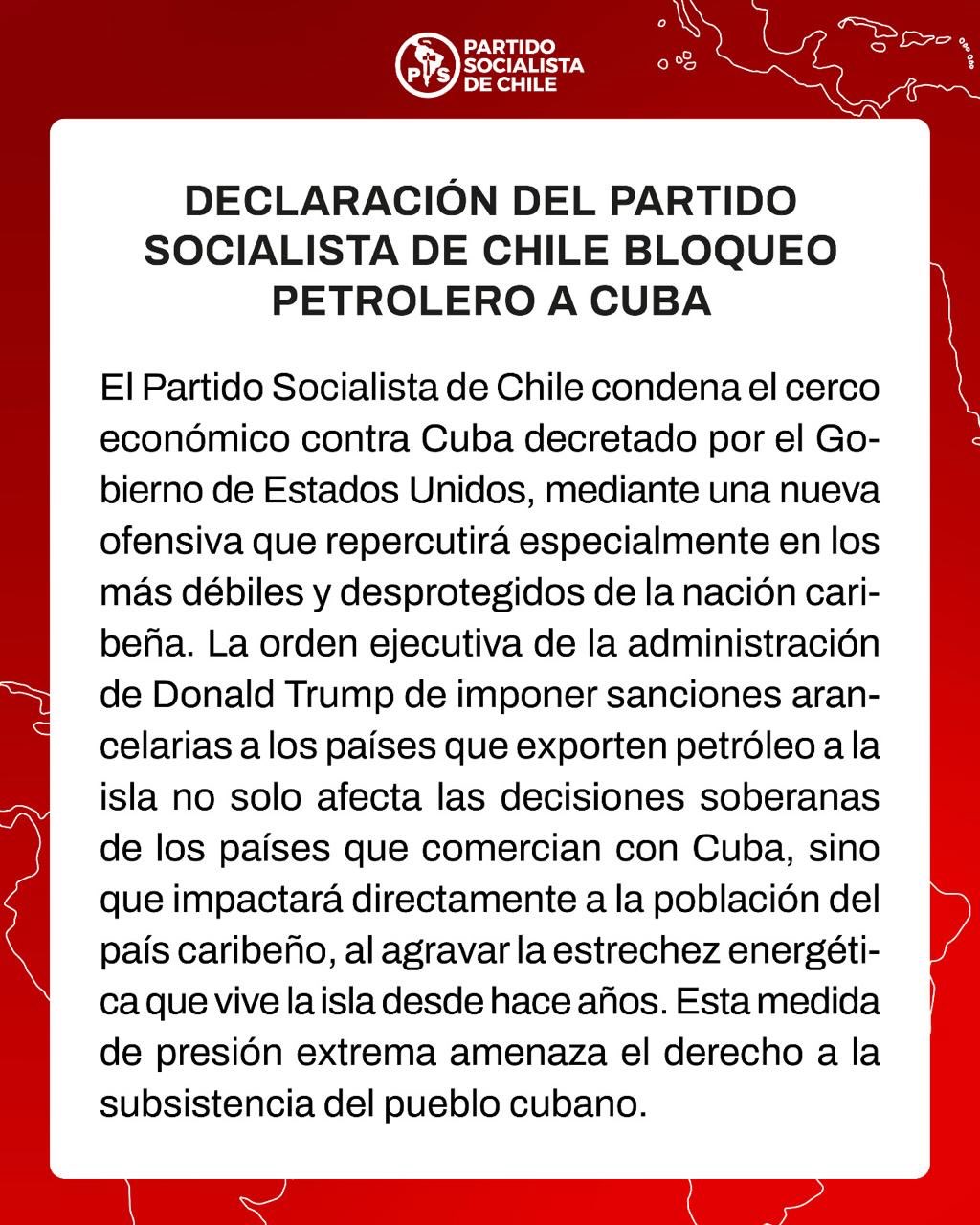 El Partido Socialista de Chile (PS) emitió un comunicado condenando la nueva ofensiva del bloqueo económico contra Cuba, materializada en la reciente orden ejecutiva del presidente de Estados Unidos, Donald Trump, que impone sanciones arancelarias a los países que exporten petróleo a la isla.