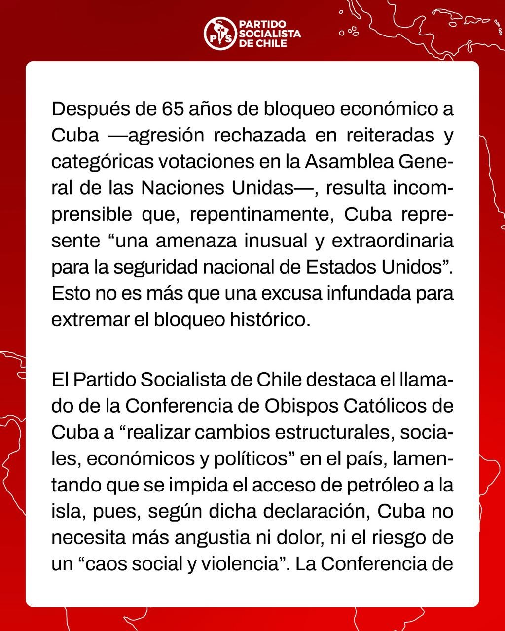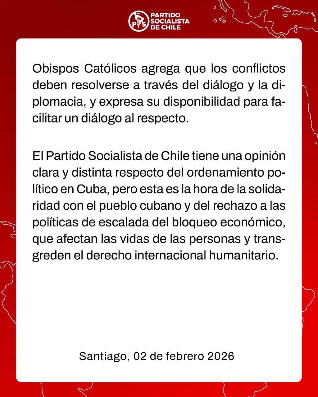El Partido Socialista trazó una línea clara entre su postura política sobre Cuba y el rechazo a las medidas de presión económica. “El Partido Socialista de Chile tiene una opinión clara y distinta respecto del ordenamiento político en Cuba, pero esta es la hora de la solidaridad con el pueblo cubano”, afirmó.