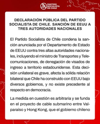 En una declaración pública emitida este sábado, el Partido Socialista de Chile expresó su enérgico rechazo a la sanción aplicada por el Departamento de Estado de Estados Unidos contra tres altas autoridades nacionales, entre ellas el ministro de Transportes y Telecomunicaciones, consistente en la denegación de visados de ingreso a ese país.