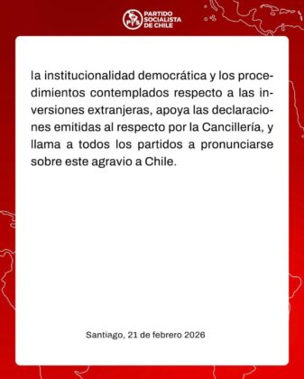 El Partido Socialista llamó a enfrentar la «pugna hegemónica» entre Estados Unidos y China desde una perspectiva que permita mantener vínculos con ambas potencias resguardando los intereses nacionales. La declaración sostiene que esta acción vulnera la soberanía nacional y el derecho de Chile a definir su política de inversiones extranjeras sin discriminación, en el marco del derecho internacional y la neutralidad tecnológica.