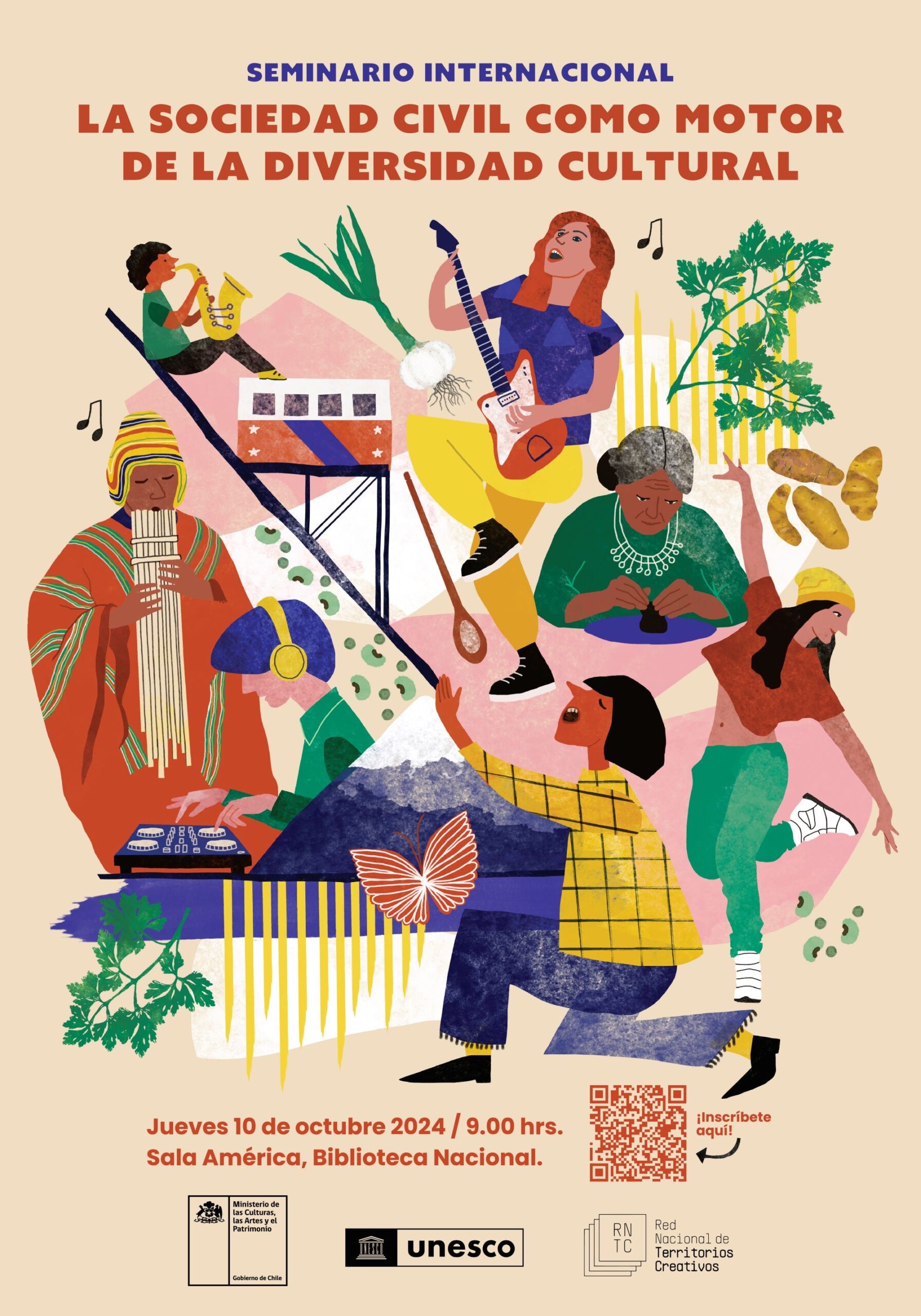 La Oficina Regional de la UNESCO para América Latina y el Caribe junto al Ministerio de las Culturas, las Artes y el Patrimonio (MINCAP), en el marco de su alianza estratégica reunirán a quienes trabajan en organizaciones de la sociedad civil, instituciones públicas y otros agentes del campo cultural del país en el Seminario internacional “La sociedad civil como motor de la diversidad cultural”, que se realizará el jueves 10 de octubre, a partir de las 9.00 horas, en la Sala América de la Biblioteca Nacional.