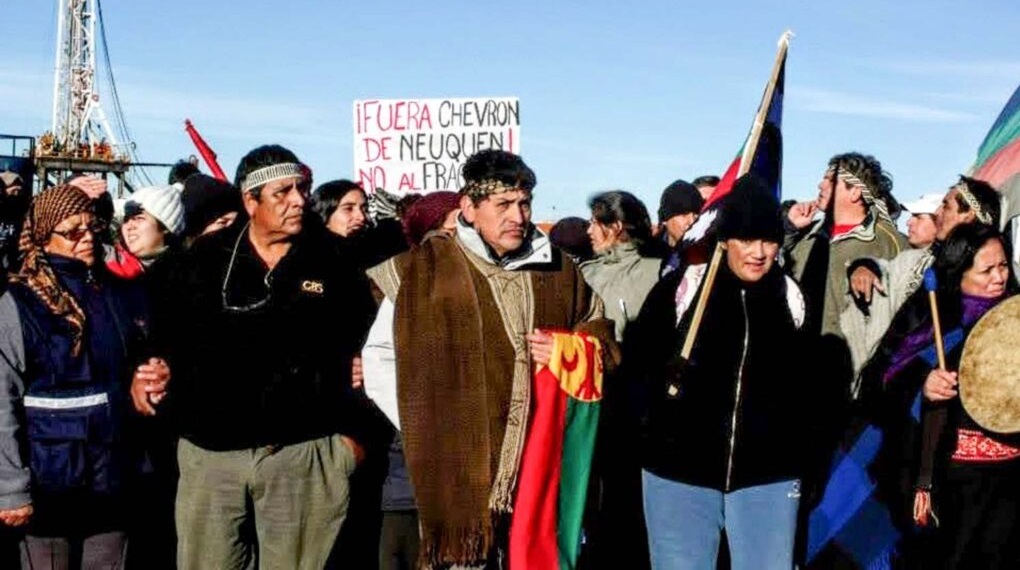 Foto: Protestas de la comunidad de Campo Maripe contra la empresa estadounidense Chevron. Foto de la Confederación Mapuche de Neuquén en Argentina