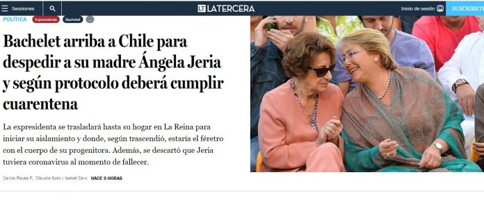 El sólo titular de la nota del diario La Tercera sorprende: “Bachelet arriba a Chile para despedir a su madre Ángela Jeria y según protocolo deberá cumplir cuarentena”