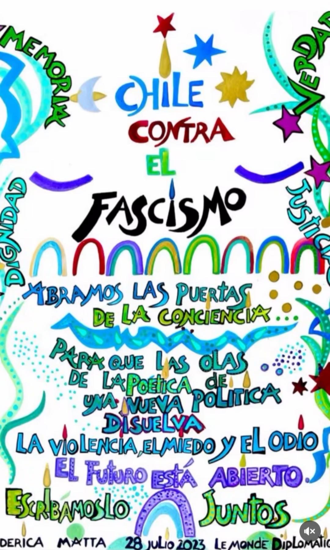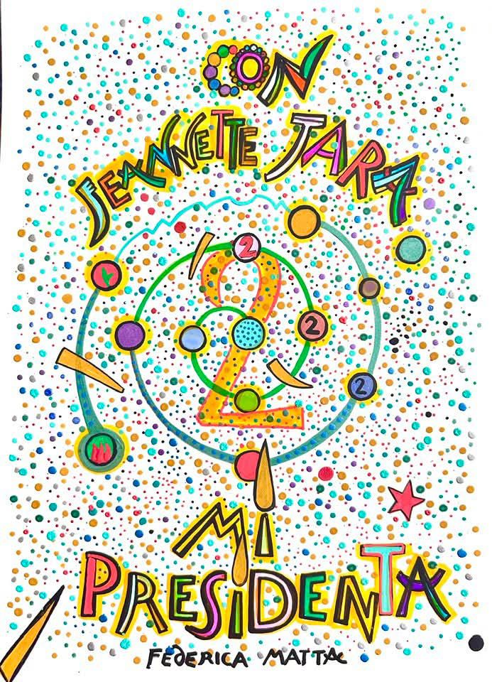 La artista plástica franco-chilena, Federica Matta, vuelve a fusionar su singular mundo imaginario y poético con su firme compromiso con Chile, esta vez a través de una serie de afiches en apoyo a la campaña presidencial de Jeannette Jara. Tanto en la primera como en la actual segunda vuelta, la artista, hija del reconocido, Roberto Matta, ha liberado en sus redes sociales vibrantes y coloridas piezas gráficas con mensajes que confrontan la encrucijada de la coyuntura política chilena: la esperanza contra el miedo y el Fascismo.